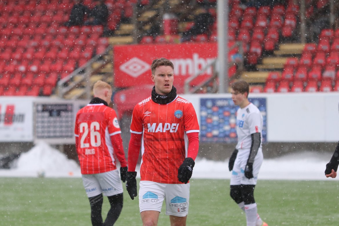 Joacim Holtan er tilbake i rødt og hvitt og startet målproduksjonen i det 12. minutt, på en fin tversoverpasning i målområdet fra Ärlig.