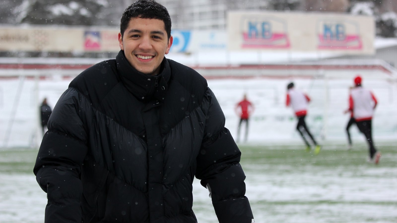 Ridouan Essaeh humper ut på den snødekte Gjemselund-matta på krykker. Han er på plass for å se lagkameratene forberede seg til sesongstart.