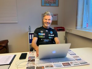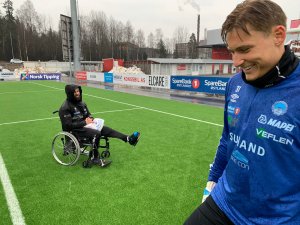 Keepertrener Johan Martin Lianes hadde tirsdag et stygt uhell med øksa. Torsdag var han på jobb for å trene KIL-målvaktene.
