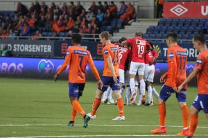 Shuaibu Ibrahim scoret 1-0 for KIL, men er langt fra fornøyd med at KIL igjen mistet poeng på slutten av kampen.